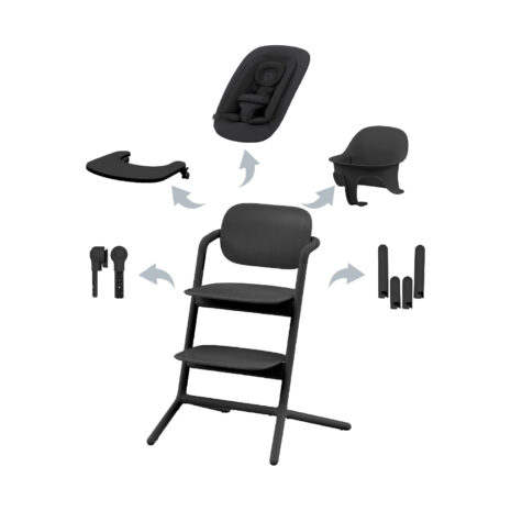 De Cybex Lemo 4-in-1 Kinderstoel Stunning Black is een moderne meegroeistoel waar je jarenlang plezier hebt. De 4-in-1 set wordt geleverd inclusief babyset, eetblad, Bouncer, Newborn inleg, Head Hugger hoofdsteun, Bouncer adapterset en Leg extensions. Op die manier kan je kindje al vanaf de geboorte in de stoel zitten. Hiervoor gebruik je eerst de Bouncer, newoborn inleg, head hugger en de adapterset. Als je kindje 6 maanden oud is kun je overgaan op de babyset en eetblad waardoor je kindje veilig in de stoel kan zitten. De kinderstoel is eenvoudig te verstellen waardoor je kindje altijd op de juiste wijze ondersteund wordt. De kinderstoel heeft een stijlvol, modern ontwerp en is bijzonder praktisch in gebruik. De kinderstoel heeft een aluminium frame dat wordt gecombineerd met een kunststof zitting en voetensteun.